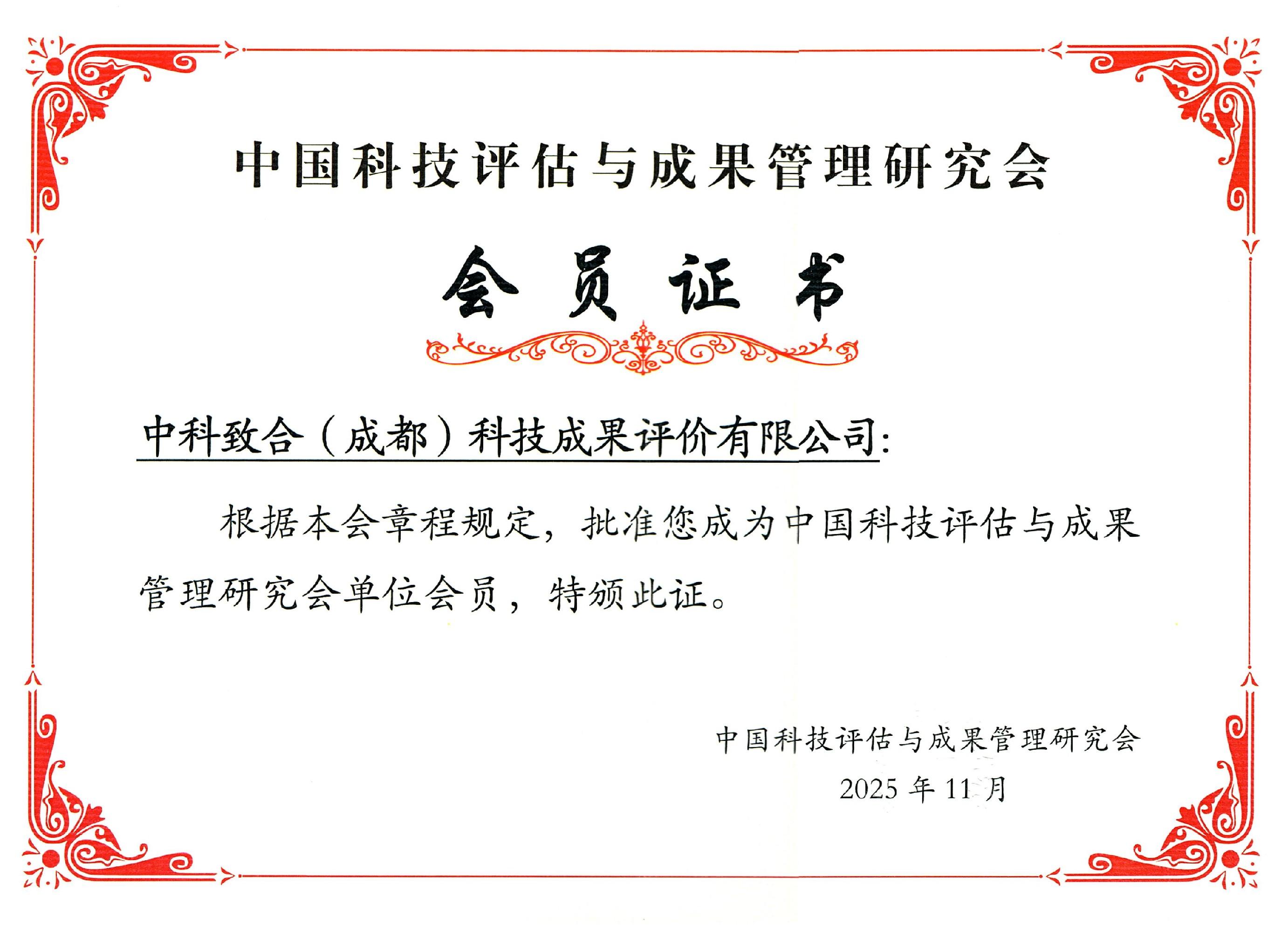 中科致合(成都)科技成果评价有限公司专注于科技成果评价、技术转移转化、创新生态建设等业务,依托专业的技术评审团队、严谨的评价方法论与丰富的产业资源,为高校、科研院所、科技企业等创新主体提供全链条科技成果评价服务,助力科技成果从 “实验室” 走向 “产业化”。加入中国科技评估与成果管理研究会后,公司将深度参与行业学术交流、标准研讨与实践协作,及时把握行业前沿动态与政策导向,进一步提升服务的科学性与精准性。